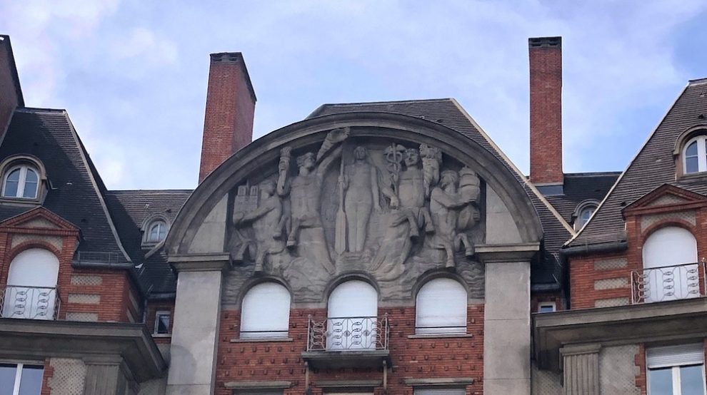 In the 1920s, the City of Paris bought the land in the southern end of the Pont-Neuf, located on the left bank, to create a new real estate complex, today called Carrefour Curie. At the top of one of the buildings is a very original sculpture : In the glory of the Seine.