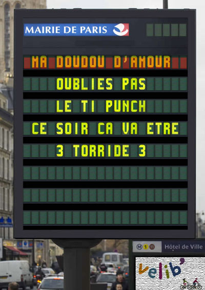 Comme l’année dernière, vous avez jusqu’au 9 février pour écrire un message de 160 caractères maximum destiné au Valentin ou à la Valentine de votre choix. La ville de paris sélectionnera ensuite les messages les plus romantiques, drôles ou originaux, et les diffusera sur les 170 panneaux lumineux de la ville toute au long de la journée du 14 février.